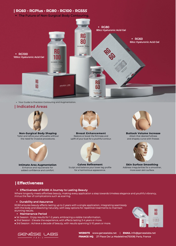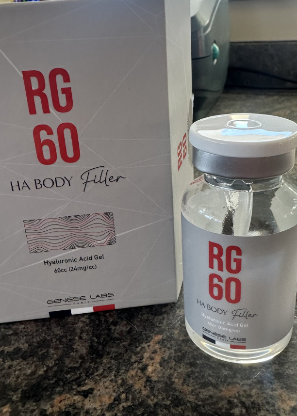 The RG60 HA Body Filler by Genèse Labs is a premium high-concentration hyaluronic acid gel engineered for non-surgical body contouring and augmentation. Formulated at 24mg/cc with 60cc volume, it delivers volumizing results that integrate seamlessly with the body’s natural tissue. Manufactured in compliance with Korea Cosmetics GMP (KCGMP) standards, the RG60 supports lasting aesthetic outcomes while dissolving naturally over time — making repeat treatments straightforward and predictable.